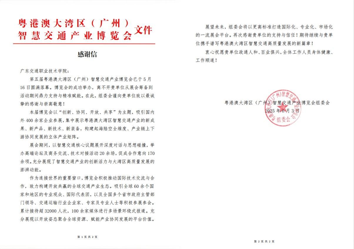 近日,博览会组委会特致我院感谢信,高度肯定我院在展会筹备及活动期间的鼎力支持与精准赋能,认为我院的贡献“充分展现了智慧交通产业的创新活力与大湾区高质量发展的澎湃动能”,标志着我院在推动教育链、人才链与产业链、创新链“四链融合”方面取得丰硕成果。